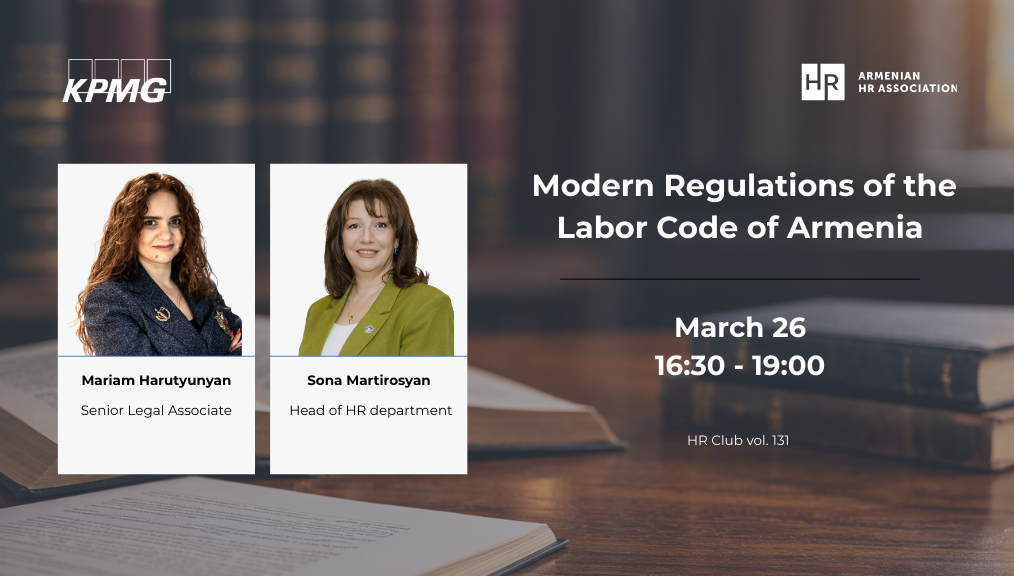 The Armenian HR Association and KPMG Armenia invite you to participate in the HR legislative discussion titled “Modern Regulations of the Labor Code of Armenia” which will take place at the Association on March 26.
